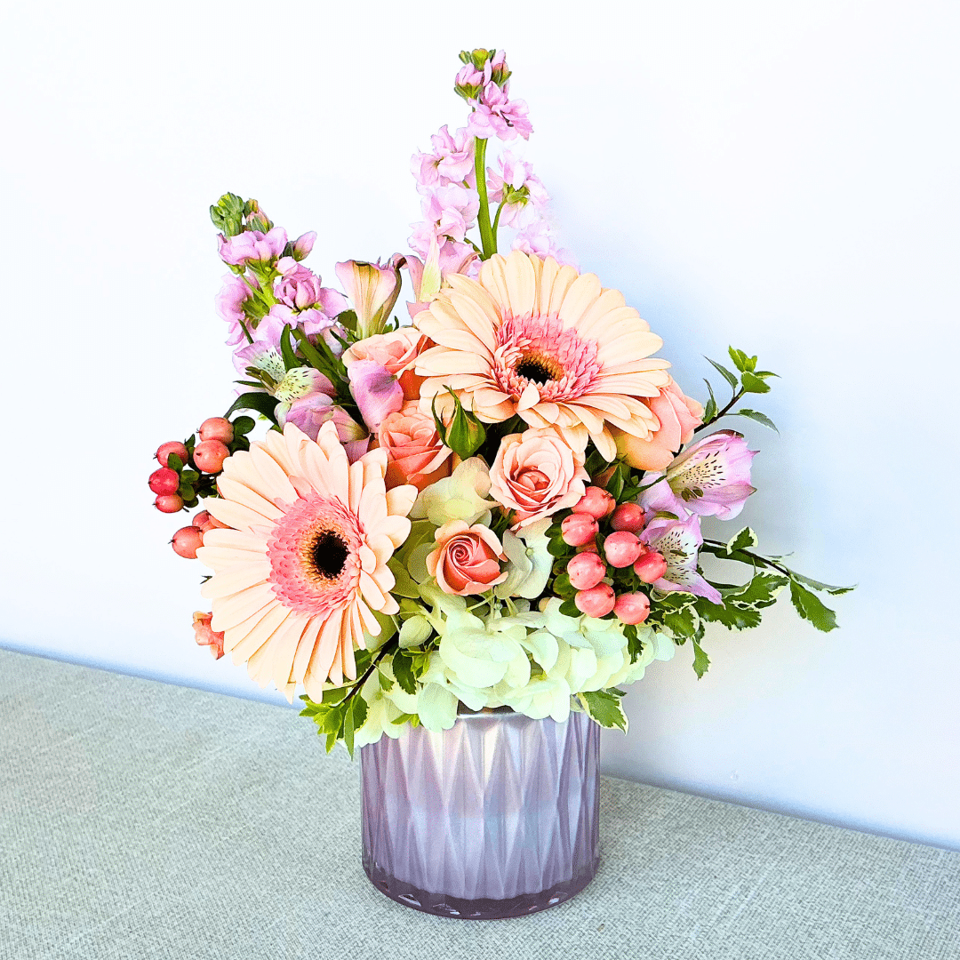 All For Her is a soft and feminine arrangement featuring peach gerbera daisies, blush roses, hydrangea, and delicate seasonal accents, artfully designed in a modern glass vase to celebrate her with beauty, warmth, and love.