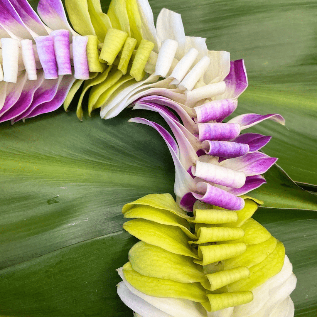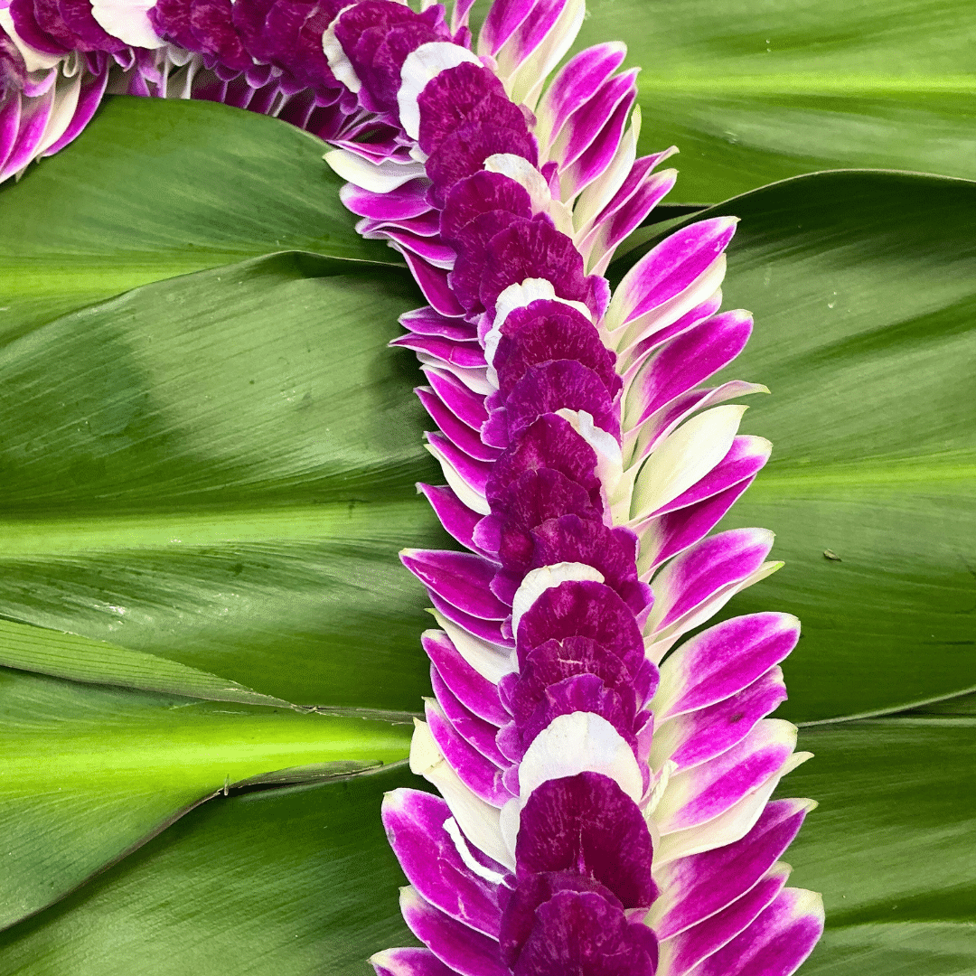Our Butterfly Orchid Leis are a true work of art! These leis come in different color combinations, based on orchid availability, so please call us to find out what colors we have this year. We may or may not have the leis pictured here. Call us for availability.