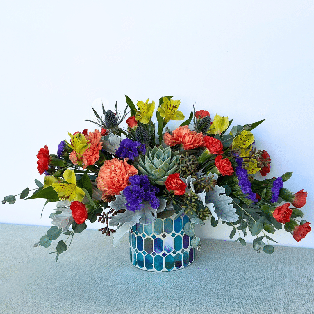Our By the Sea beachy bouquet is an arrangement of jewel-tone seaside flowers in a blue mosaic vase.
