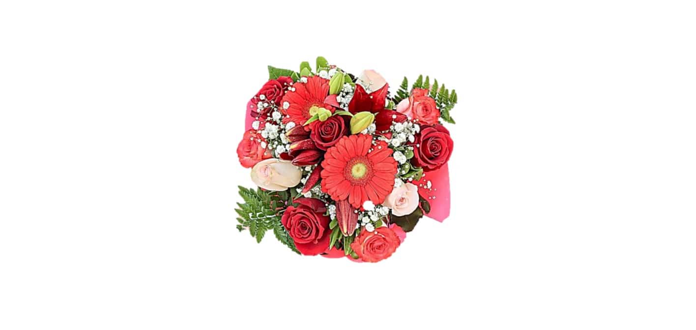 A romantic wrapped bouquet in shades of pinks and reds perfect for your Valentine!