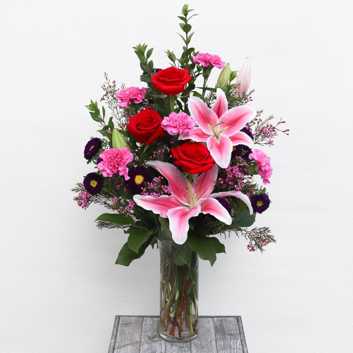An impressive way to say I Love You! Quality roses and Stargazer lilies mixed with carnations and asters are designed in this pink and red bouquet flower arrangement in a clear cylinder vase.
