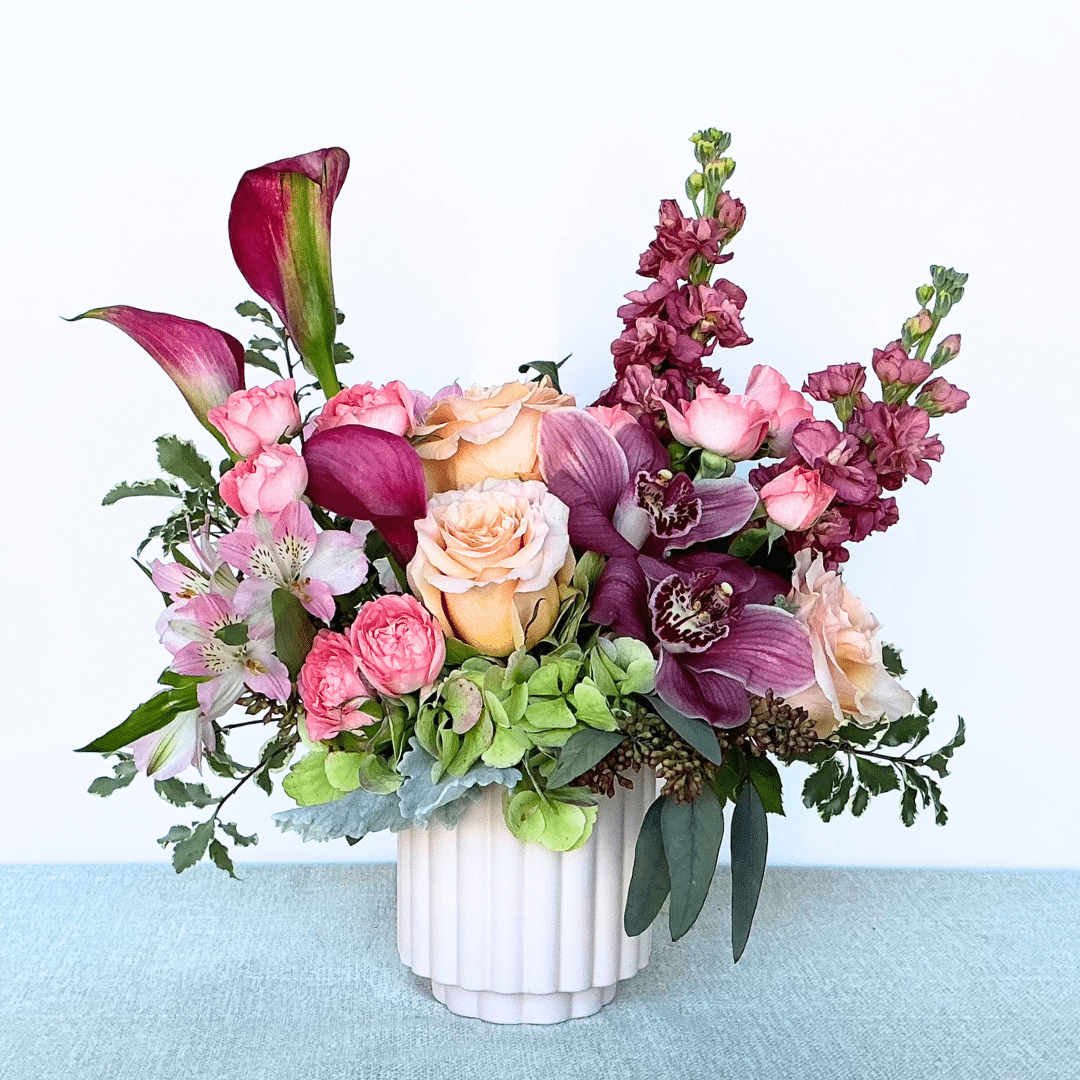 Calla lilies, roses, hydrangea, and orchids come together in Grenada, a beautiful floral creation in soft pinks and mauves, artfully arranged in a scalloped ceramic pink container.