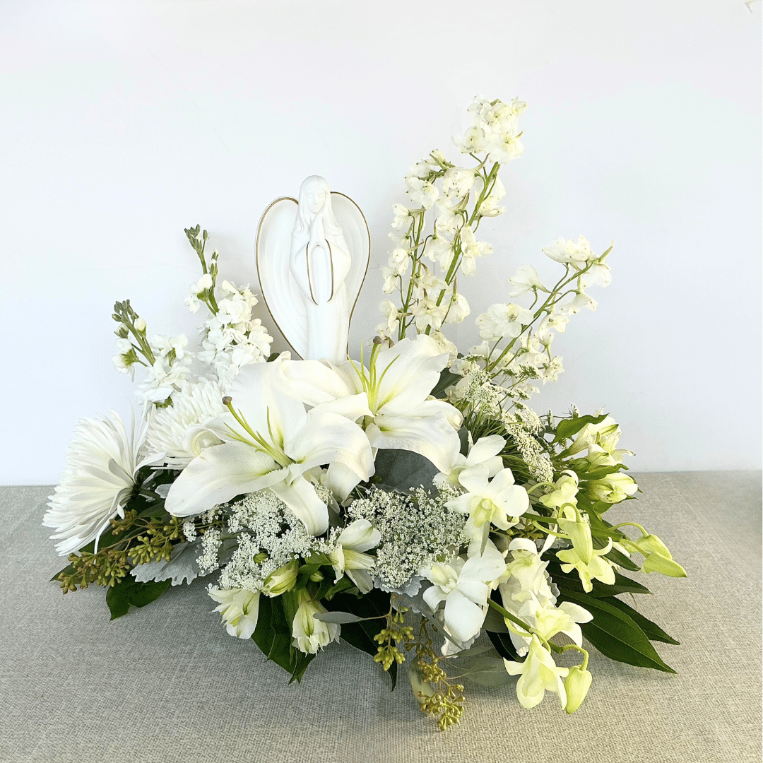 This peaceful and serene angel flower arrangement is a perfect choice for the holiday. The white ceramic angel is embossed with gold outline on her wings and is lovingly centered in a gorgeous Easter bouquet. Colors for our Guardian Angel flowers may be changed to complement your preference.